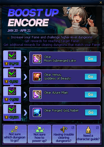Earn extra rewards by achieving certain Fame levels and clearing specific dungeons!