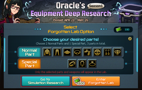 After selecting equipment parts including 2 normal parts and 1 special part, you can enter Forgotten Lab after consuming 100 Lab Vestige Tracker. You can also get bonus rewards based on your Forgotten Lab entry count!