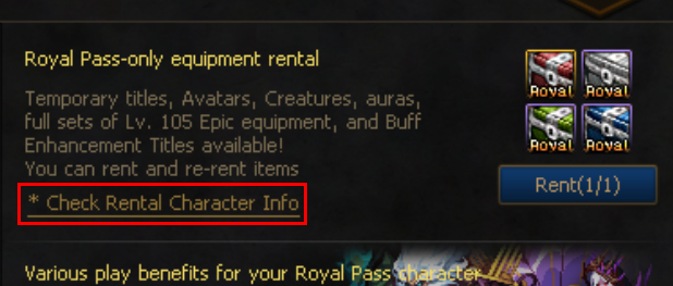 Click on "Check Rental Character Info" through Arad Pass > Royal Pass tab. |