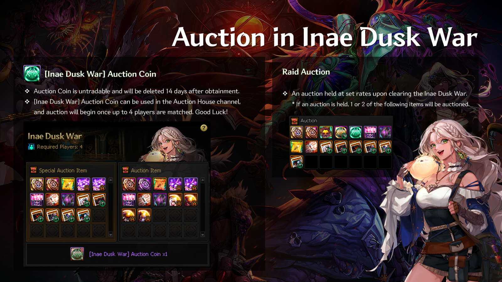 As the prelude content for Delezie Raid, we hope the Inae Dusk War update will offer our Adventurers new and important insight, along with in-game gearing opportunities, for the upcoming final battle with the infamous Apostle of Plague!