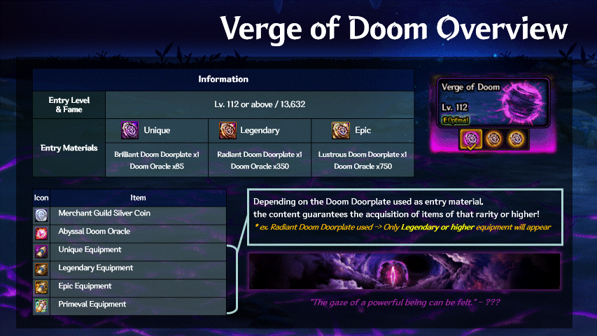 In Verge of Doom, you will be guaranteed an equipment from the same tier or higher as the Doorplate used. Also, you will have a chance to get greater rewards (similar to the Mystical Fortune lucky rewards in the normal Disciple of Doom). Of course, the base rewards of Silver Coins and Abyssal Doom Oracles can also be obtained.