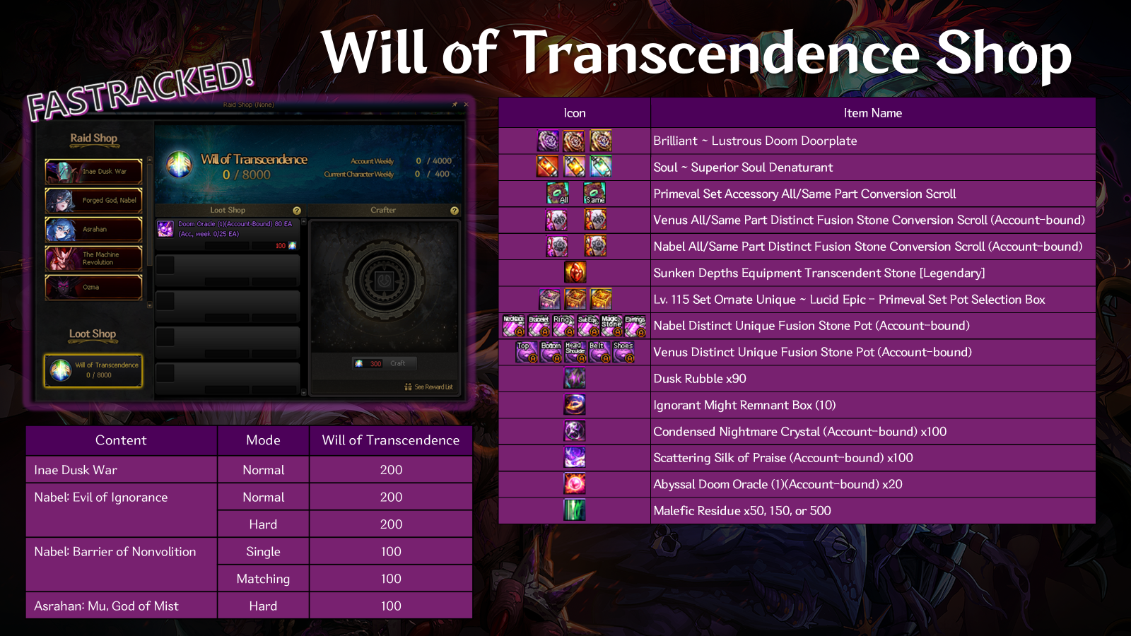 Will of Transcendence can be used to purchase Doom Oracles or obtain various rewards through its Crafter system. All rewards obtainable through Will of Transcendence are account-bound, and can be freely distributed and used on the characters of your choice so don't forget to check it out every week as crafting chances are reset every Tuesday.