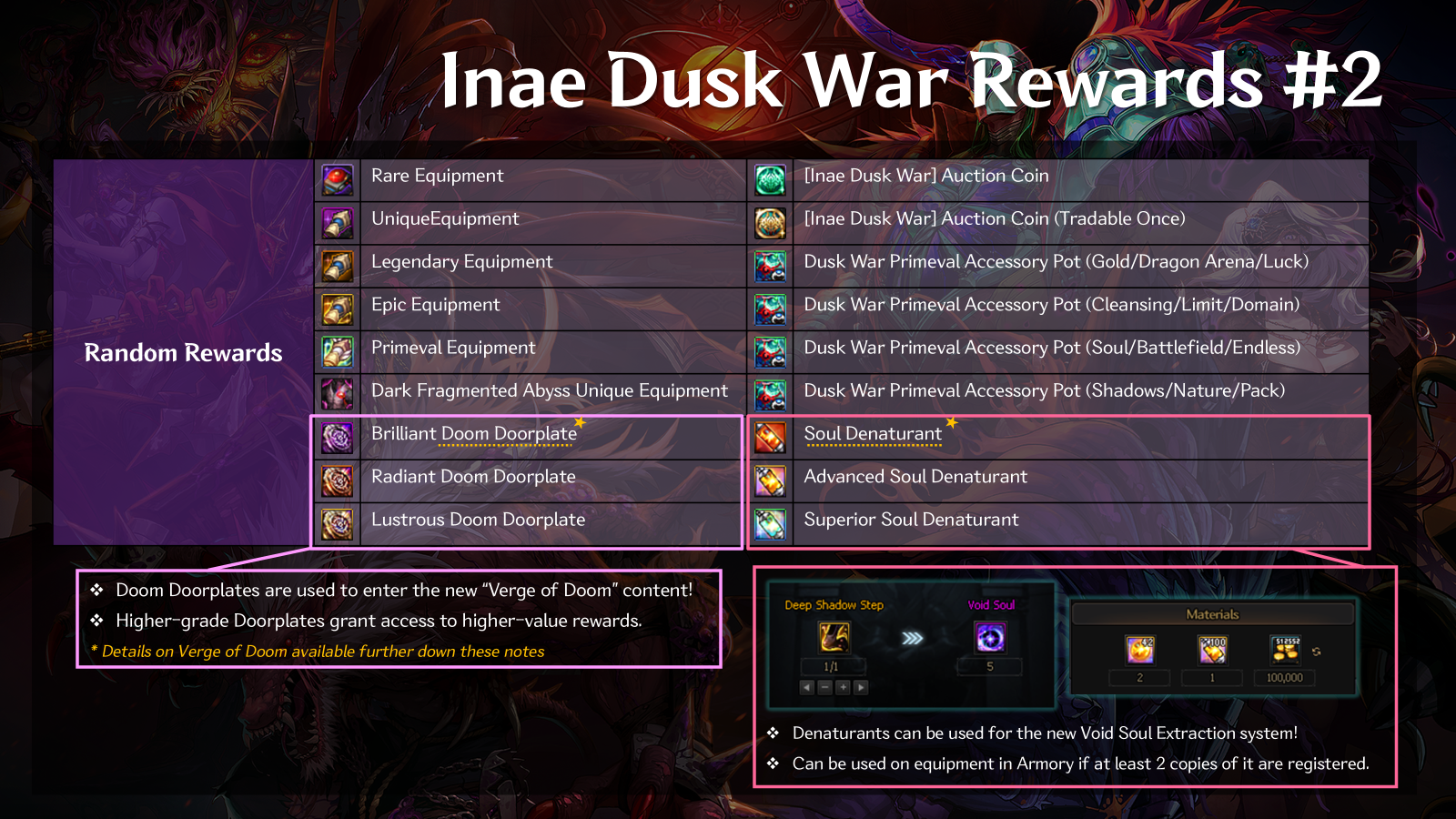 Along with the usual Sunken Depths gear and Auction Coin rewards, these Denaturants and Doorplates are newcomers as of the Inae Dusk War update.