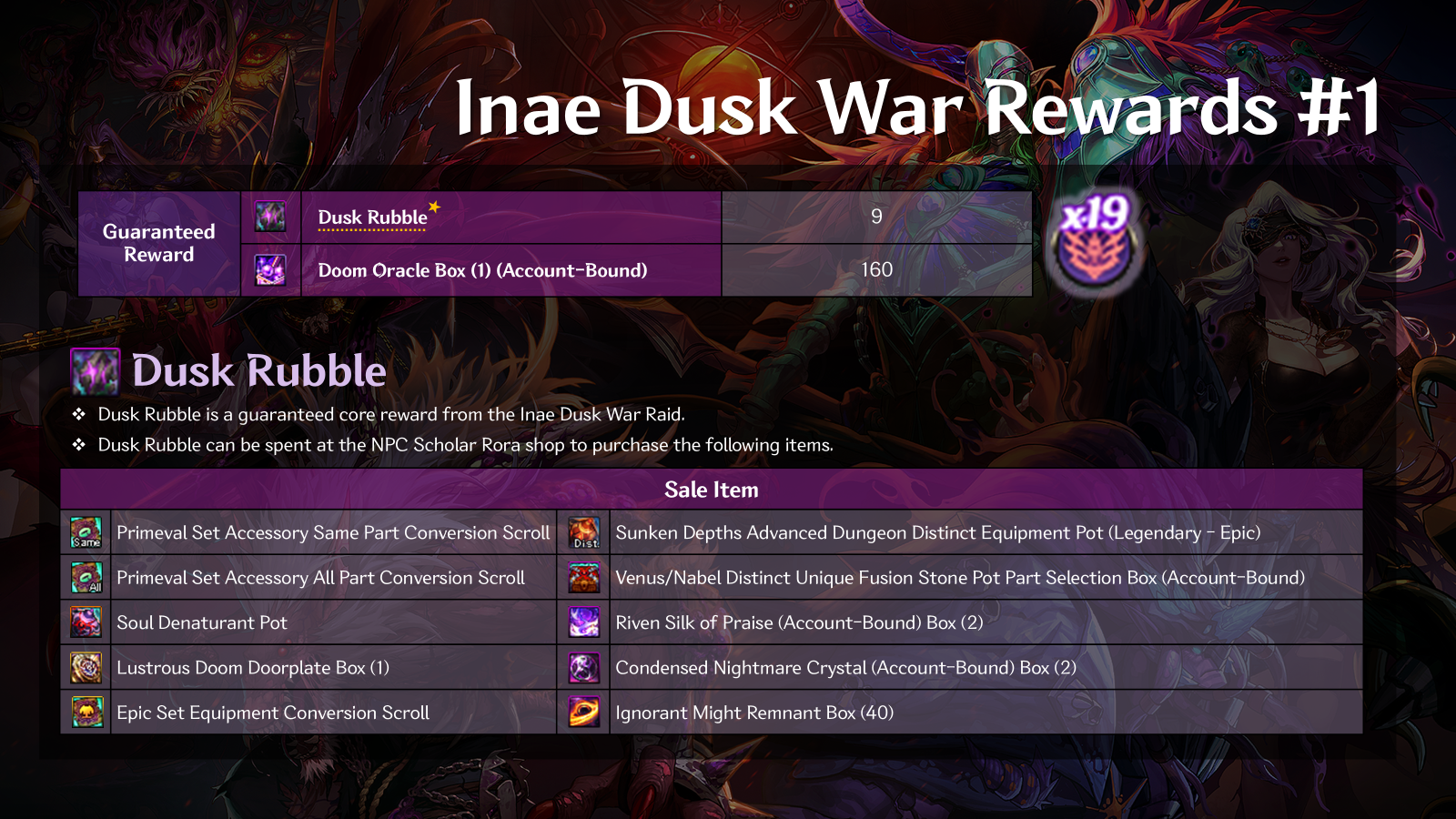 Dusk Rubble will be the main guaranteed reward and material obtained from Inae Dusk War, which can be used to buy items from the NPC Scholar Rora Shop. These include items that will help you fine-tune your Armory and current build more through items such as Conversion Scrolls, Equipment and Fusion Stone Pots, and other content mateirals.