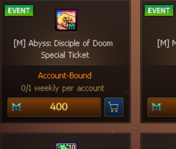 A ticket used to enter the Abyss: Disciple of Doom dungeon without spending Fatigue. 1 ticket is consumed upon entering the map, allowing entry for 1 character only. [Available Dungeons] This ticket is consumed before Abyss: Disciple of Doom Tickets and Entry materials in the inventory. |