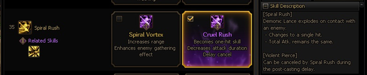 - Skills affected by the currently selected Skill Evolution option can be viewed in Related Skills.
