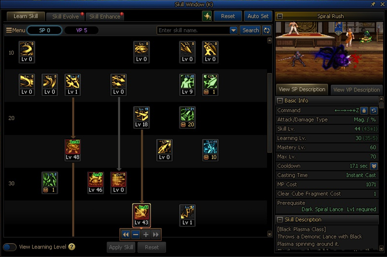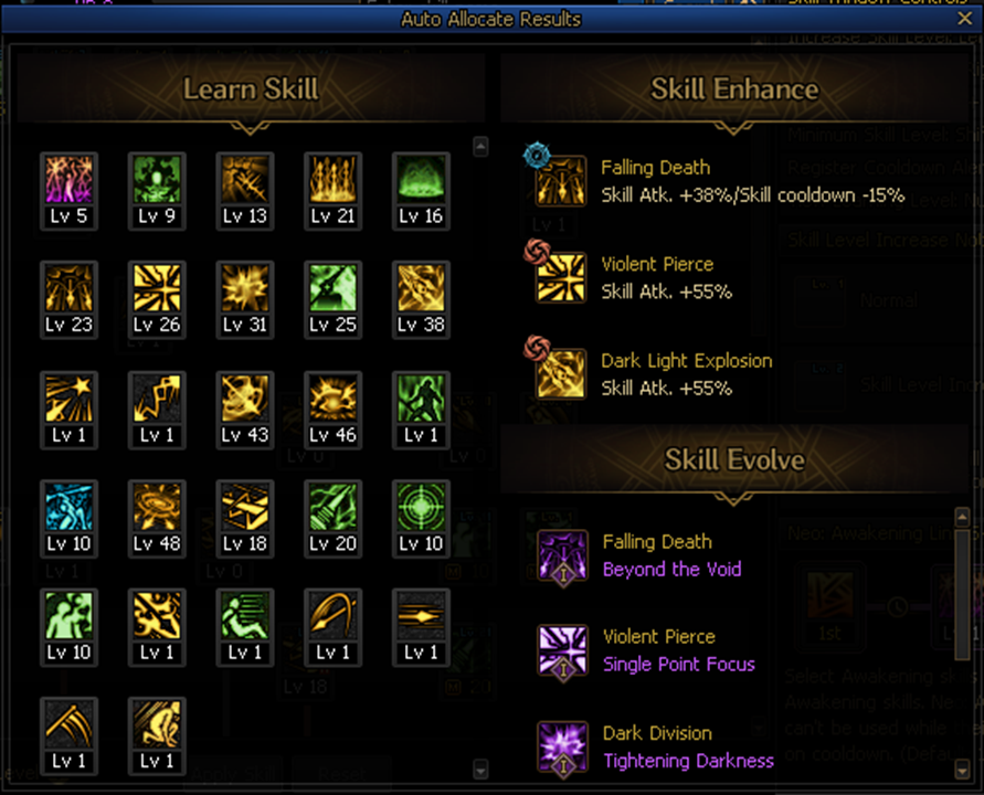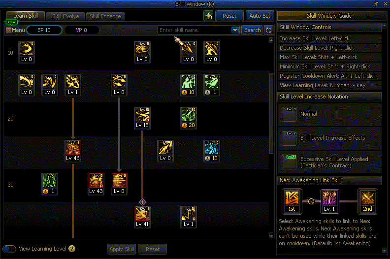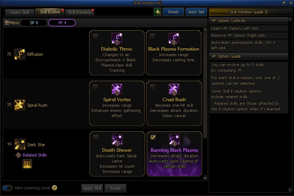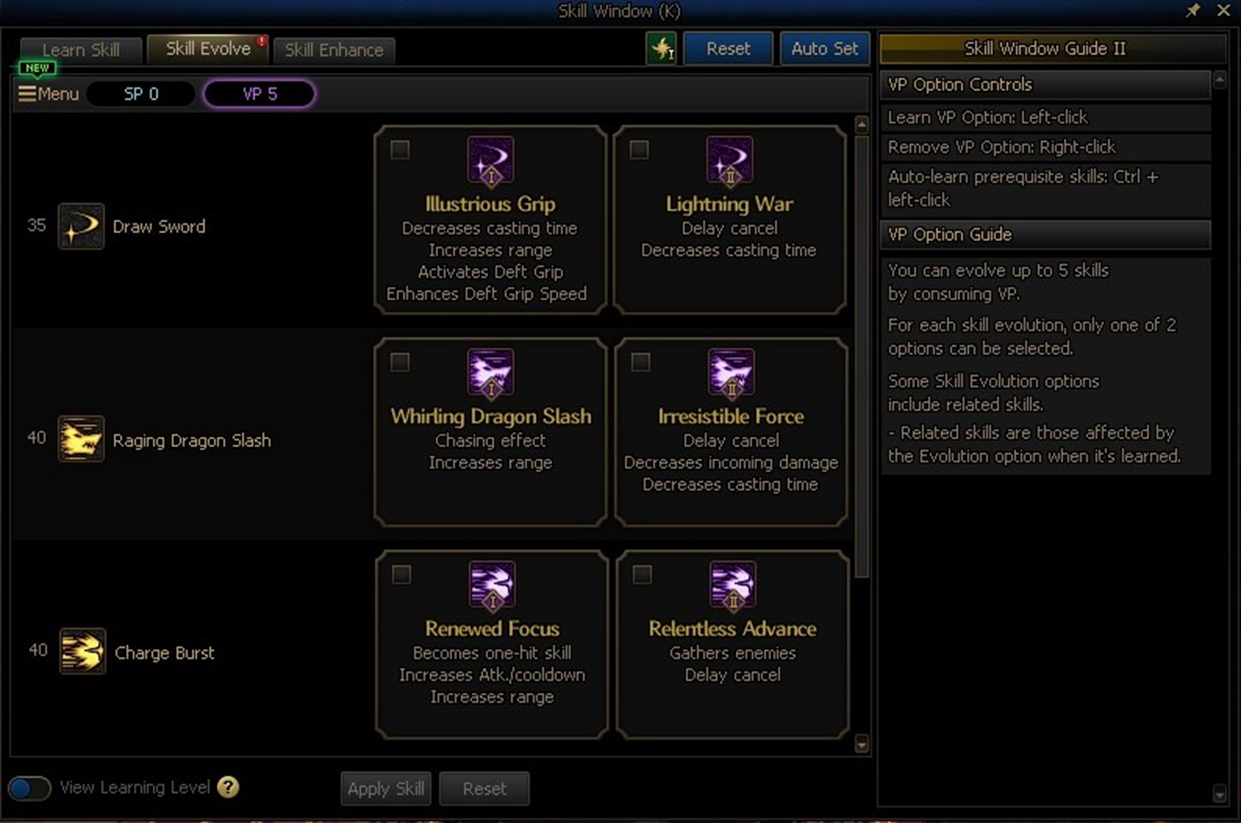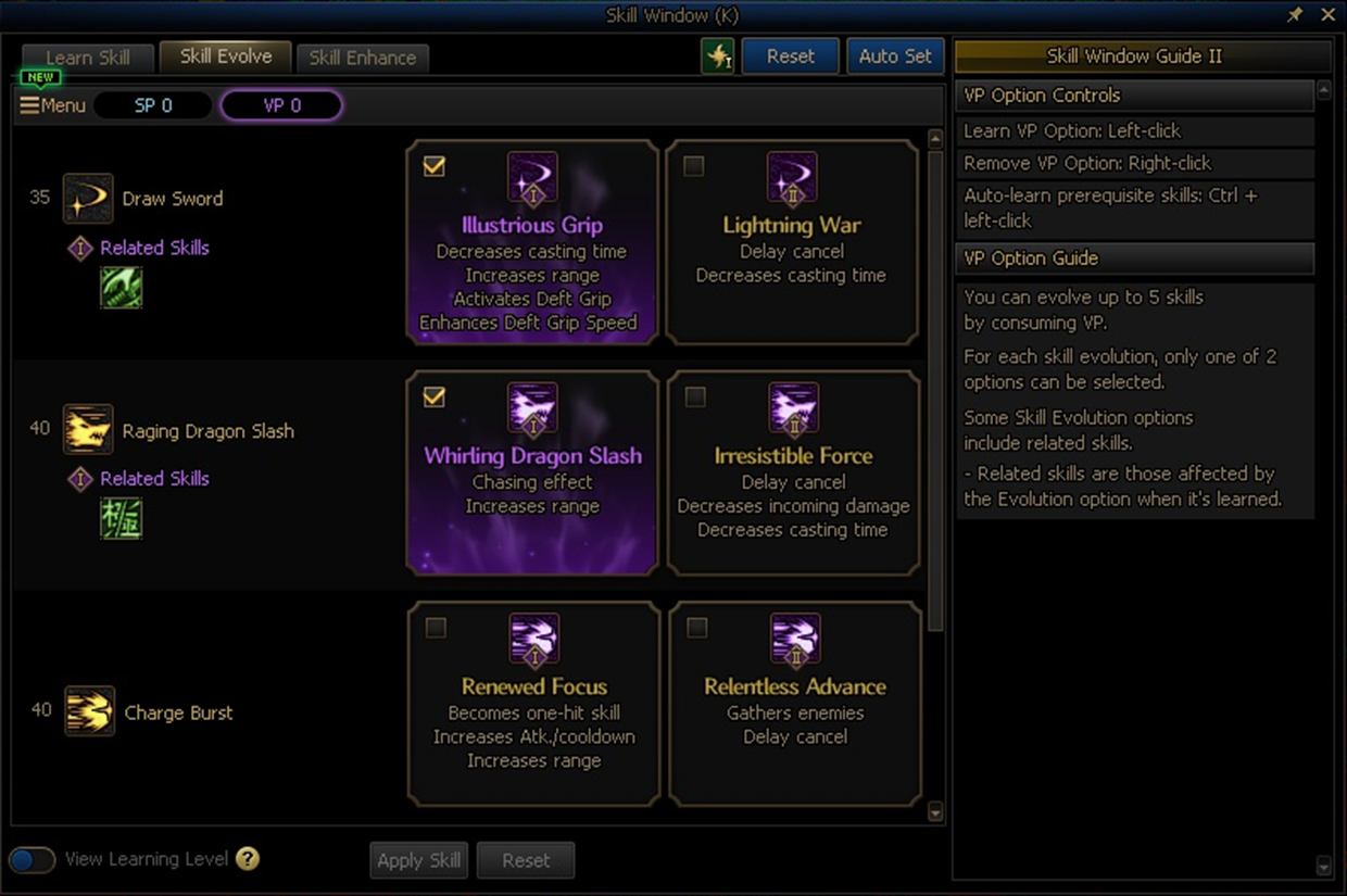 - The Evolution option is only activated for skills learned at Level 1 or higher in the "Learn Skill" tab.