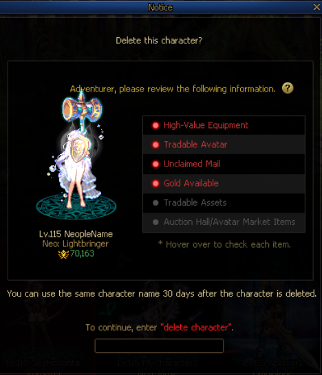 A Checklist Notification Window will now appear when you attempt to delete a character.